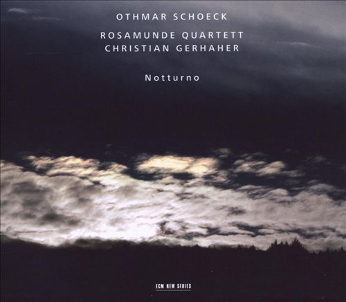 Notturno was composed between 1931 and 1933, and sets the world-weary verse of Nikolaus Lenau (1802-1850) and one fragment by Gottfried Keller (1819-1890) for voice and string quartet. The cycle is threaded by an elusive leitmotif of regret over a failed extra-marital affair. There is a mournful quality to this music that one also finds, as Heinz Holliger points out in an introductory note, in the tearful lyricism of Alban Berg and Arnold Schönberg. Over the course of five movements, we find ourselves lost in a forest of shadows, hoping for any sign of moonlight to break the silence with its song. All we get, however, are words dripping with liquid night, each a cloud waiting to burst into storm. Replete with moisture, flora, and withered emotions, Lenau’s sentiments range from cynical (“In consternation I desired / That we both should die”) to resigned morbidity (“I love this gentle death”), but always with an “unmannered” (to borrow Holliger’s term) sadness. Bavarian baritone Christian Gerhaher shapes each syllable like a blind carver: that is, as if with his hands and in darkness.
