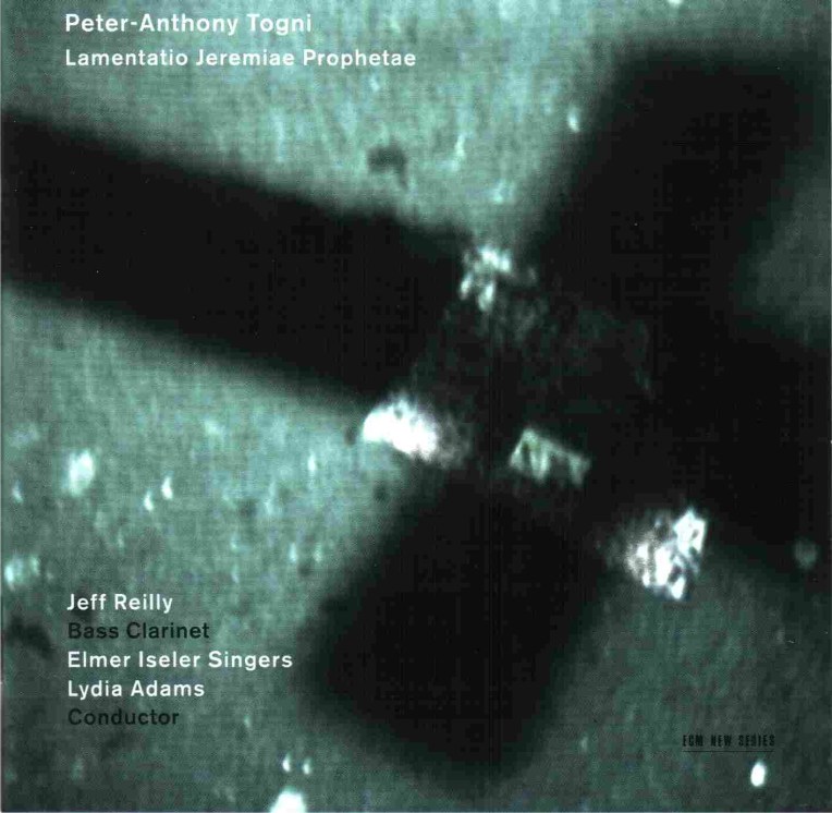 Nova Scotian composer Peter-Anthony Togni gets his long overdue inauguration into ECM’s hallowed halls with this gorgeously conceived “concerto” setting of Jeremiah’s Book of Lamentations. A bass clarinet dons improvisatory clothing as the Prophet in question, wandering the streets of a complacent populace, represented here by a modest vocal ensemble. Jeff Reilly is the virtuoso soloist and provides a nuanced performance against the choir’s own measured readings.