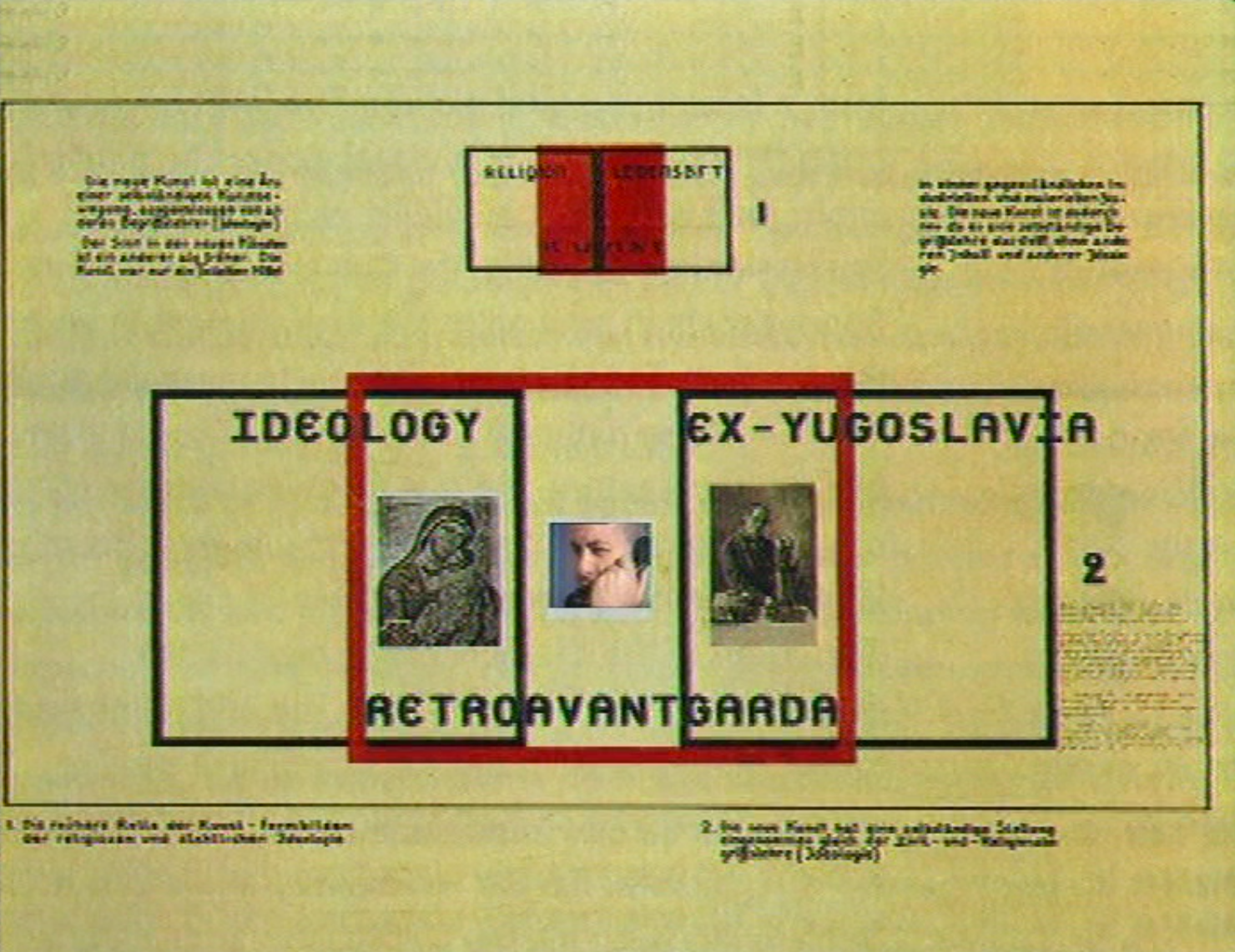 The 1997 project Postsocializem + Retroavantgardia + IRWIN (Post-socialism + Retro Avantgarde + IRWIN) turns critique into philosophical inquiry. Gržinić frames the discussion while Žižek and Weibel articulate the stakes of avant-garde resistance amid radical restructuring. Žižek argues that the avant-gardist seeks to preserve an ancient core more faithfully than the liberal desire for perpetual fragmentation. This is not a rejection of Enlightenment values but a defense against their appropriation by market forces that claim rationality while enforcing structural inequality. Retro-avant-gardism becomes an act in which reason and action invert themselves. Ideology enters the body only when the body has been damaged. Manifestos appear as shattered fragments because post-socialist reality leaves no space for unbroken narratives. Even Lévi-Strauss’s culinary triangle becomes an allegory in Žižek’s hands. The region’s toilets tell stories about national identity, hygiene, and cultural pride, transforming domestic infrastructure into a commentary on power.
