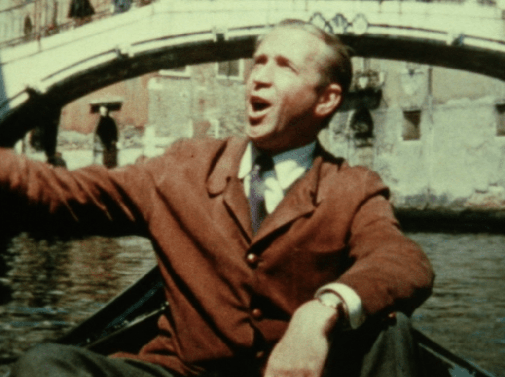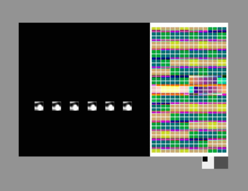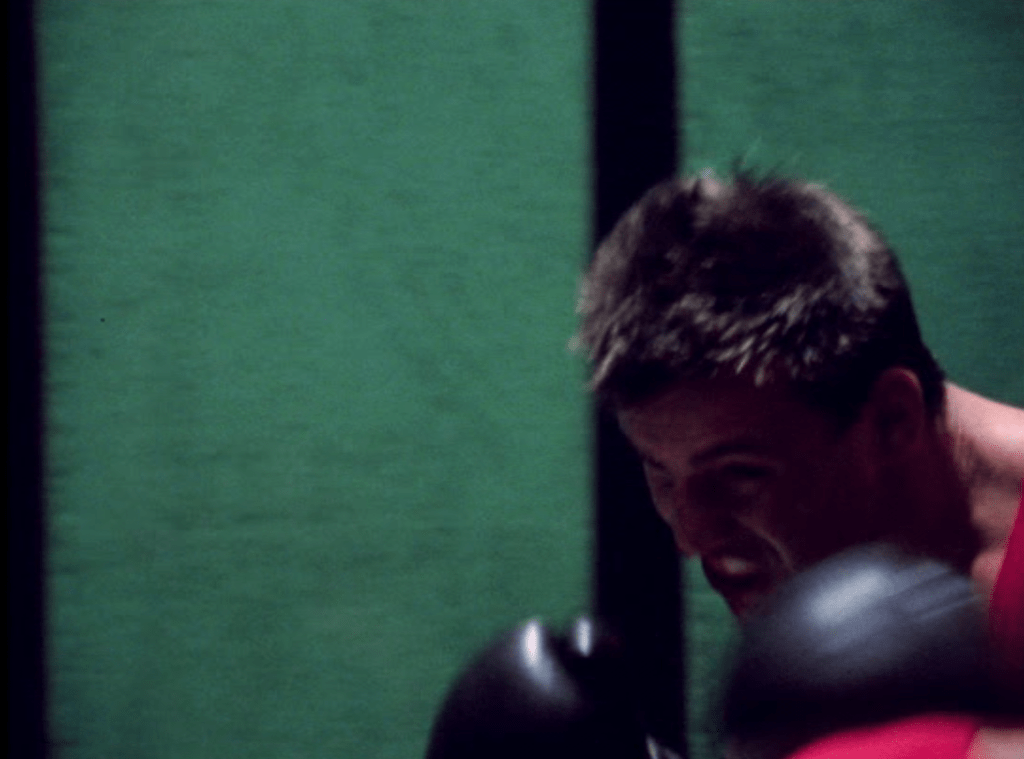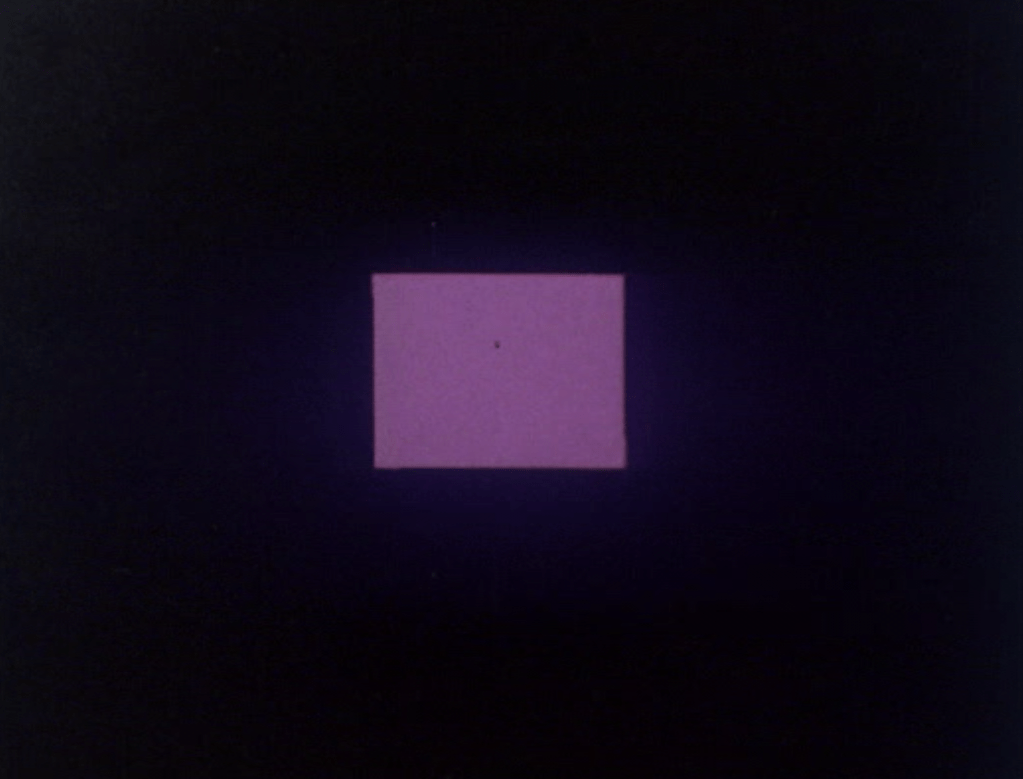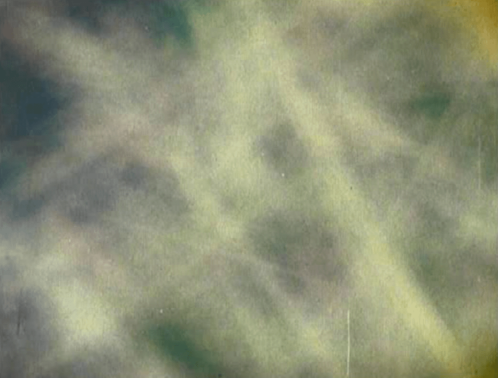 This shift from the microscopic to the elemental reappears in Übung (Exercise), where a figure is thrust toward the camera, lit as if by an emergency sign from within. Strobes slide across sweat and skin until the figure becomes particulate, edging toward ash. Schwarzensee repeats the experience through landscape: bands of colored water glide past while the creak of a rowboat grounds the abstraction in human effort.