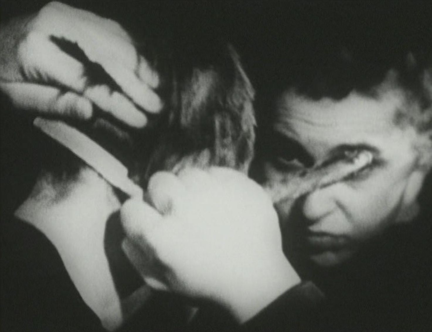 By 1973, EXPORT had entered a more introspective yet no less unsettling phase. Her short piece …Remote…Remote… stands as one of her most emblematic works. It is quietly devastating, almost unbearable to witness. As she sits before the camera, she peels away her cuticles with a boxcutter, allowing the blood to rise before submerging her fingers in a bowl of milk. The juxtaposition of pain and nurture, violence and purification, creates a ritual of self-inspection. Behind her hangs a family photograph, beckoning the viewer to consider wounds inherited across generations. When she finally leaves the frame, hands appear—linked, ghostlike—connecting past and present in an uneasy continuum. Here, norms themselves become the sites of self-harm, a theme she explores with feverish complexity in Invisible Adversaries (1976).