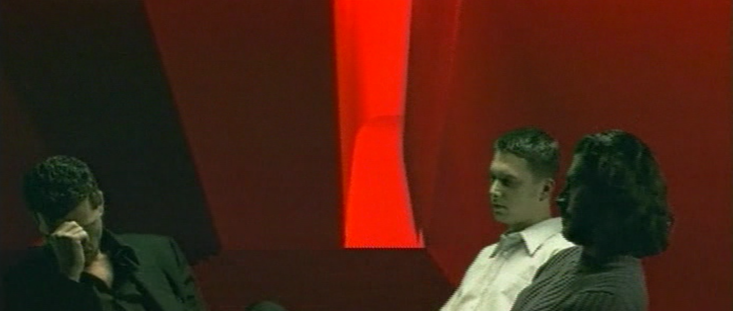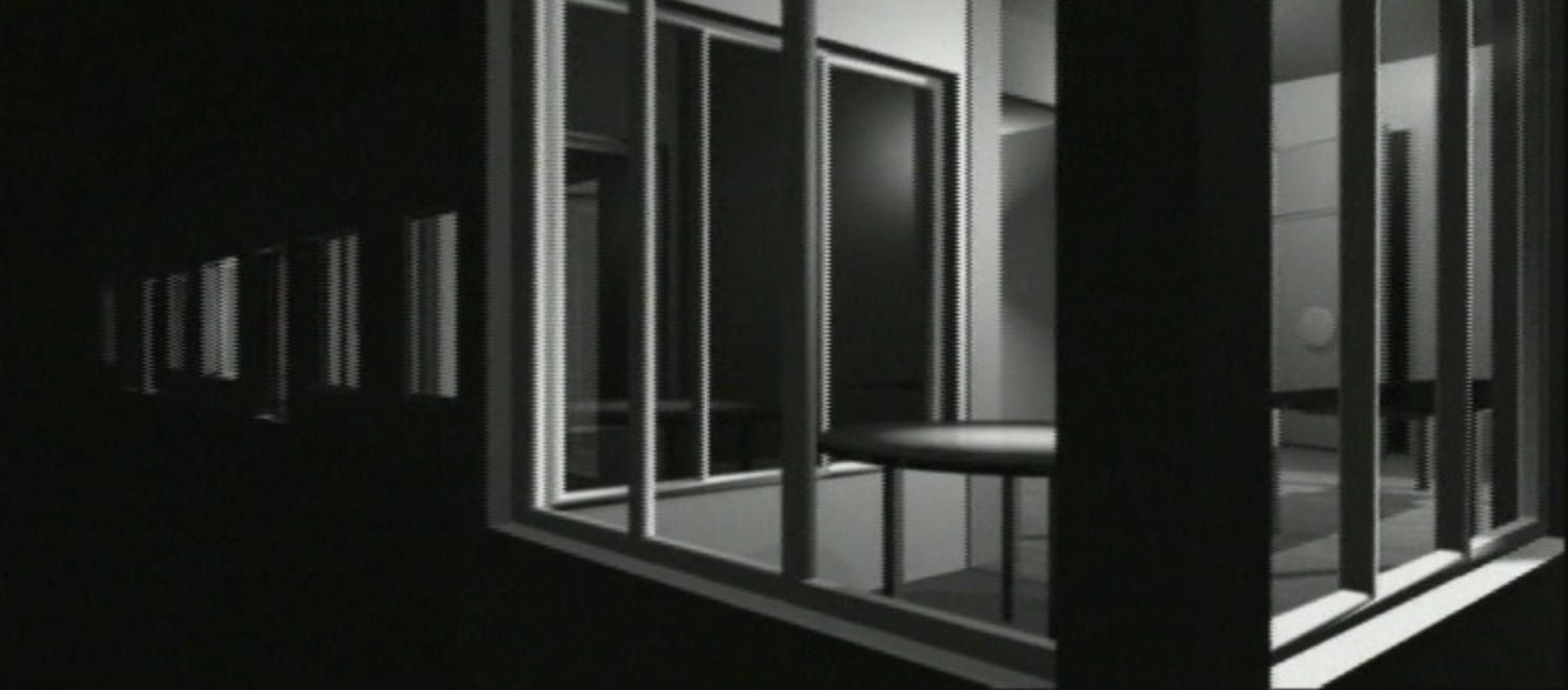 In collaboration with Elisabeth Fiege, Ruhm extends this exploration in ID Remix (1999), which reconstructs virtual spaces inspired by Godard’s La Mépris and Nouvelle Vague and by Brian De Palma’s Dressed to Kill. Three figures are trapped in a sequence without identity or purpose. They stand in postures that imply intent but yield nothing. Ruhm writes that “a still frame is set into motion,” yet the motion does not release them. The camera circles, but the characters remain mute and isolated, while the purified environments around them seem to reject their very presence. They are ghosts in their own mise-en-scène, expelled until only outlines remain.