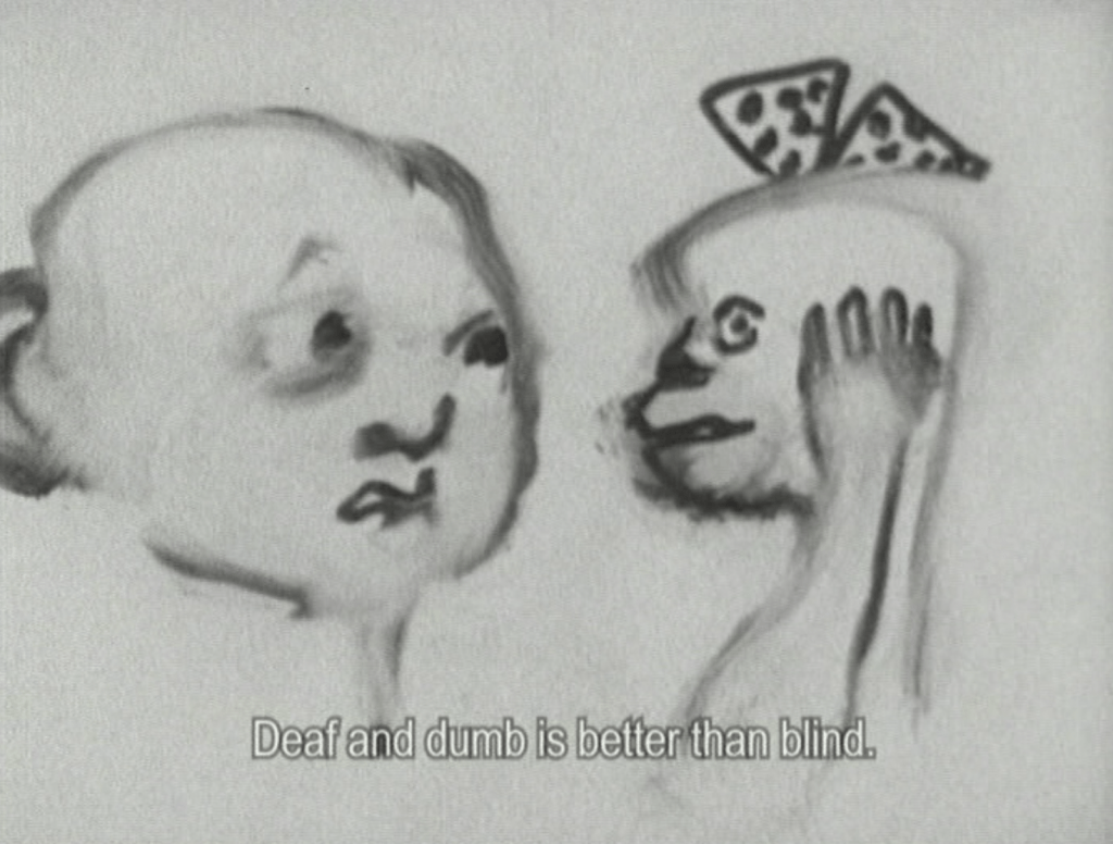 Childhood curiosity takes on unsettling pliability in Les Miserables (1987), animated with water-soluble pigments and the artist’s own saliva. A boy and a girl wander in search of another girl, whose genitalia prompts the question, “Is that real?” Her violation reduces her to vowels, a prelinguistic utterance that is less than language. Set in the impossible year 1001, the film warns that “hearing and sight are easy to blight.” Innocence and injury fold into each other, Mattuschka’s sealing the sequence.