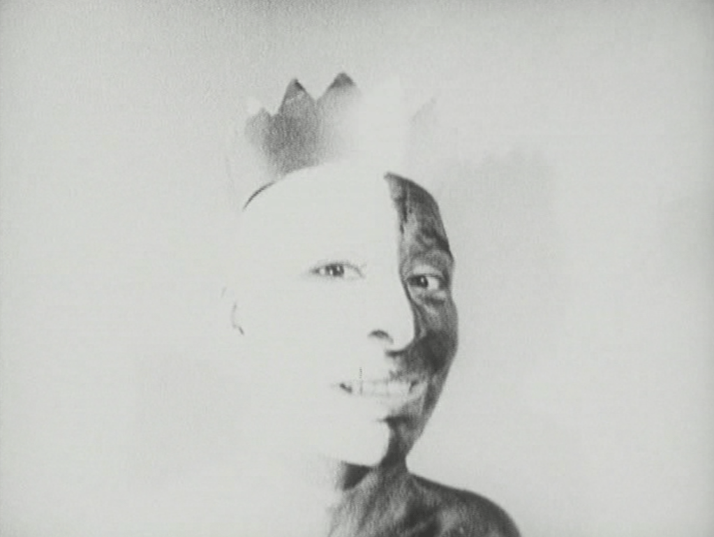 This early philosophy materializes vividly in Nabelfabel (NavelFable, 1984), in which Mattuschka stages a second birth through pairs of tights in what amounts to a ritual and a comedy rolled together into one. Magazine mouths, newspaper masks, notebook-paper credits: all media collapse as she plunges her head into the nylon cocoon and wrestles her way out by means of lips, tongue, and face. Negative images flare; lines are drawn and abandoned. The sound skitters as a distressed record, a creation myth in the form of a self-portrait.