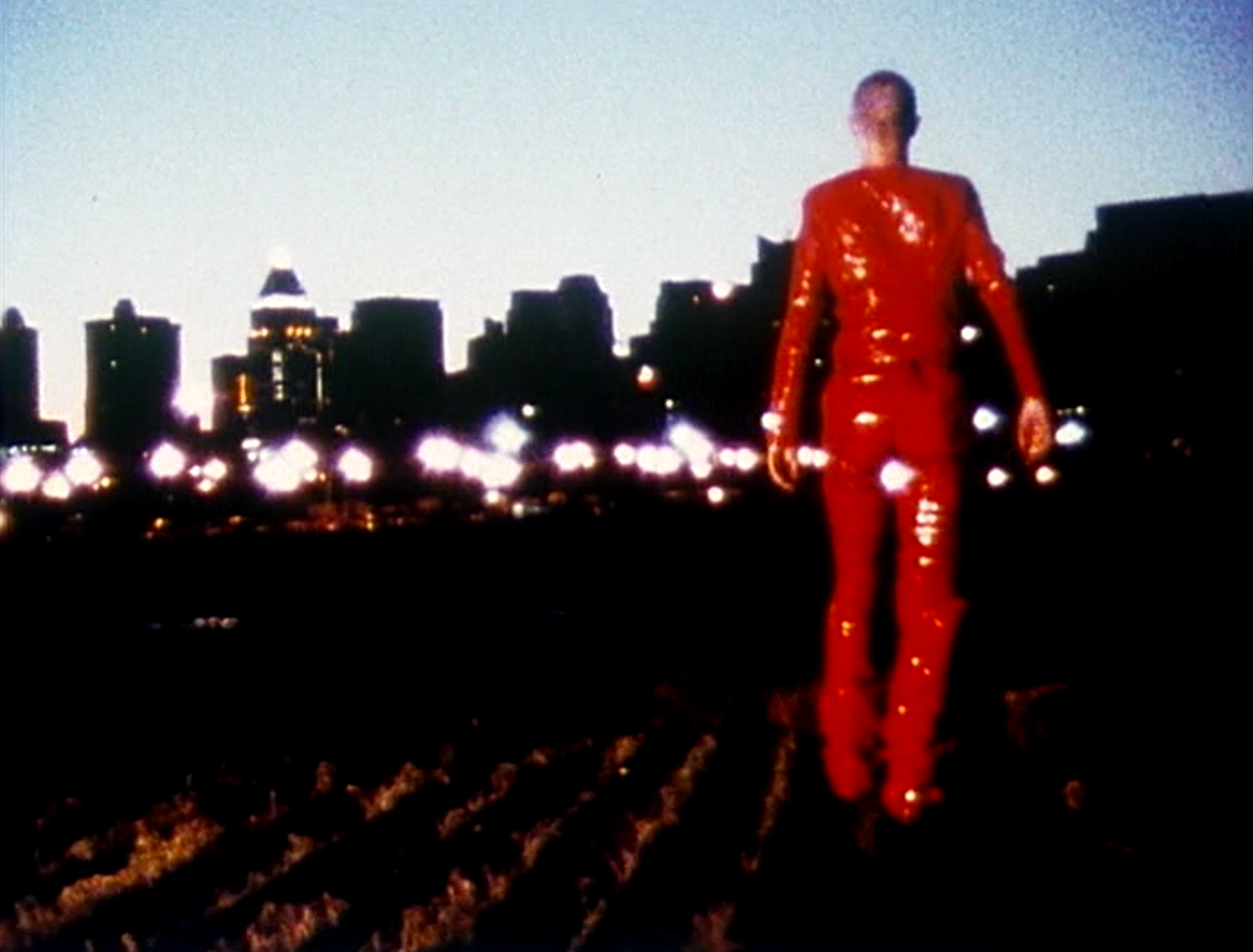 Spy soon meets Volley (Ursula Pürrer), a volatile “sexed-up pyromaniac” whose fires serve as both erotic vocabulary and survival strategy. Her early scenes take place in a skating rink or some abandoned industrial corner. She masturbates, convulses with pleasure, then casually sets the place ablaze. Fire is not a symbol but the material of desire itself. Into this circuitry enters Nun (Hans Scheirl), an “amoral alien” wrapped in red plastic who moves through the city like a predatory seductress with no regard for human coherence. She eats snails and unnameable matter and loses a hand after devouring what may be an explosive possum. Her appetite is endless, her body a site of ongoing damage and regeneration. She gathers violence, humor, and eros into a single gravitational presence, the embodiment of anti-naturalism.