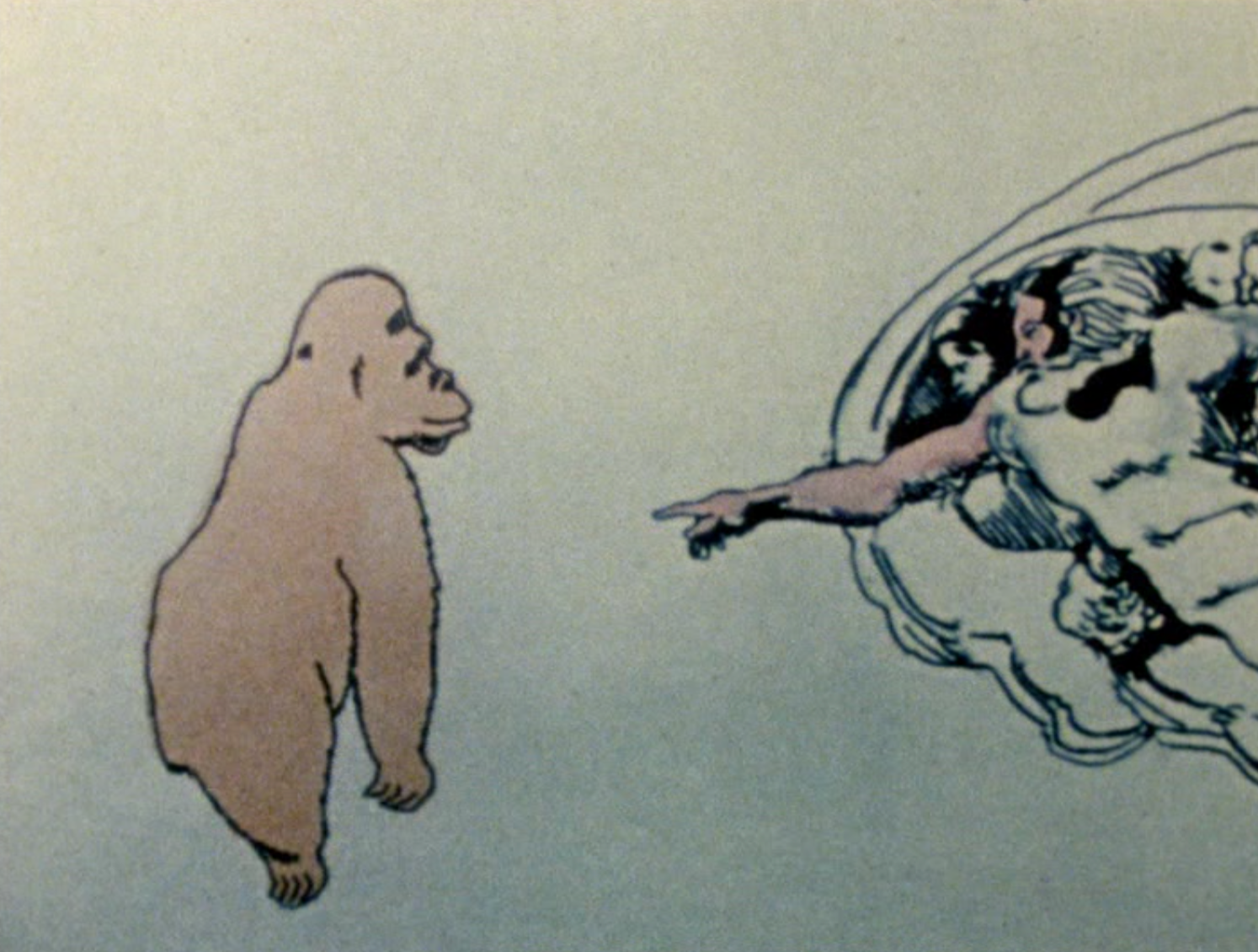 Shapes (1972) presents silhouetted figures dancing to Bach’s harpsichord, later joined by starched-cloth stop-motion forms. The result is an animated counterpoint in which shapes stretch and collapse with the music, each silhouette a brief embodiment. Couples (1972) extends this into a portrait of relational struggle. Awkward figures pair and separate, pursuing and avoiding one another. Lassnig uncovers the animal core of domestic life. A man complains, “I have my needs and desires, but you’re not my universe,” only to hear, “Oh? This is life?” Magazine cutouts erupt into Terry Gilliam-style interludes that remind us how romance becomes a collage of need, illusion, and endurance.