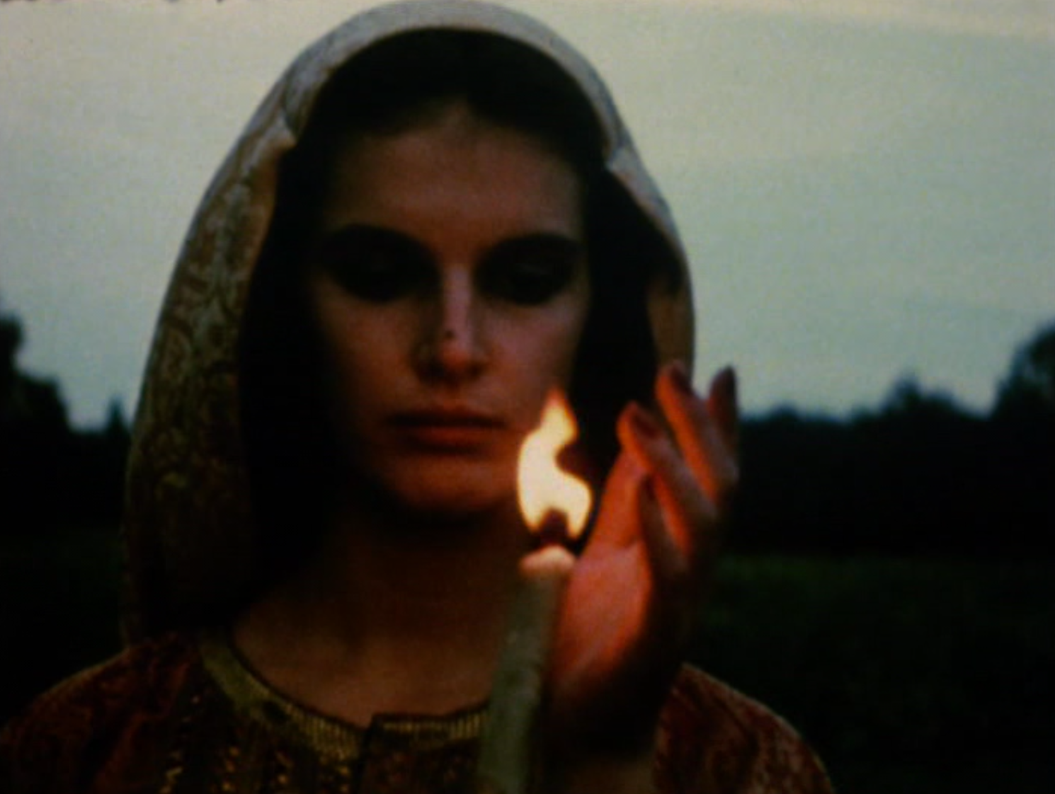 Baroque Statues (1970-74) begins as a dialogue between religious sculpture and the living human body. The camera turns, zooms, and trembles around the saints, mimicking their gestures and completing what the stone cannot express. Regal Baroque music rises, and Lassnig pivots from carved figures to flesh: a woman outdoors, dancing in a costume that hovers between historical pageant and playful novelty. She overlays colors, freezes frames, and distorts movement in an effort to determine the temperature at which stone shades into skin and skin eventually becomes immaterial. Organ music lifts the sequence into a meditation on vitality, on the tension between cultural ideal and interior sensation.