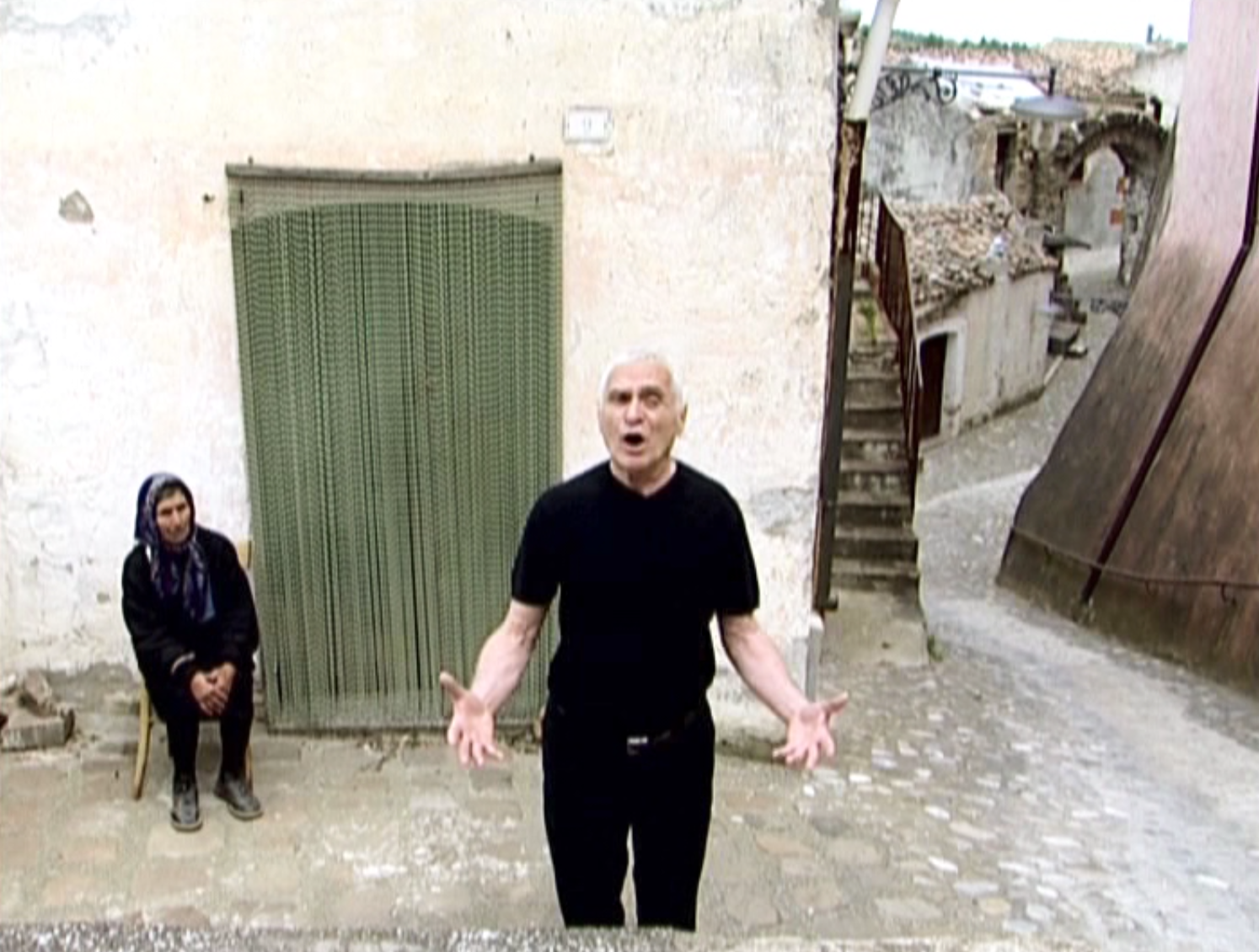 This insistence on subjectivity announces itself from the beginning in John Giorno and Antonello Faretta’s Just say no to family values (2006), which stages an ecstatic performance in a tiny southern Italian village built to repel the unfamiliar. An elderly woman quietly observes Giorno as he recites his poem of the same name, a text that celebrates drugs as sacred substances and mocks Christian fundamentalism as a cultural virus, his voice ringing against the village’s stone surfaces. Giorno’s sentiments land gently in the air and harshly in the psyche.