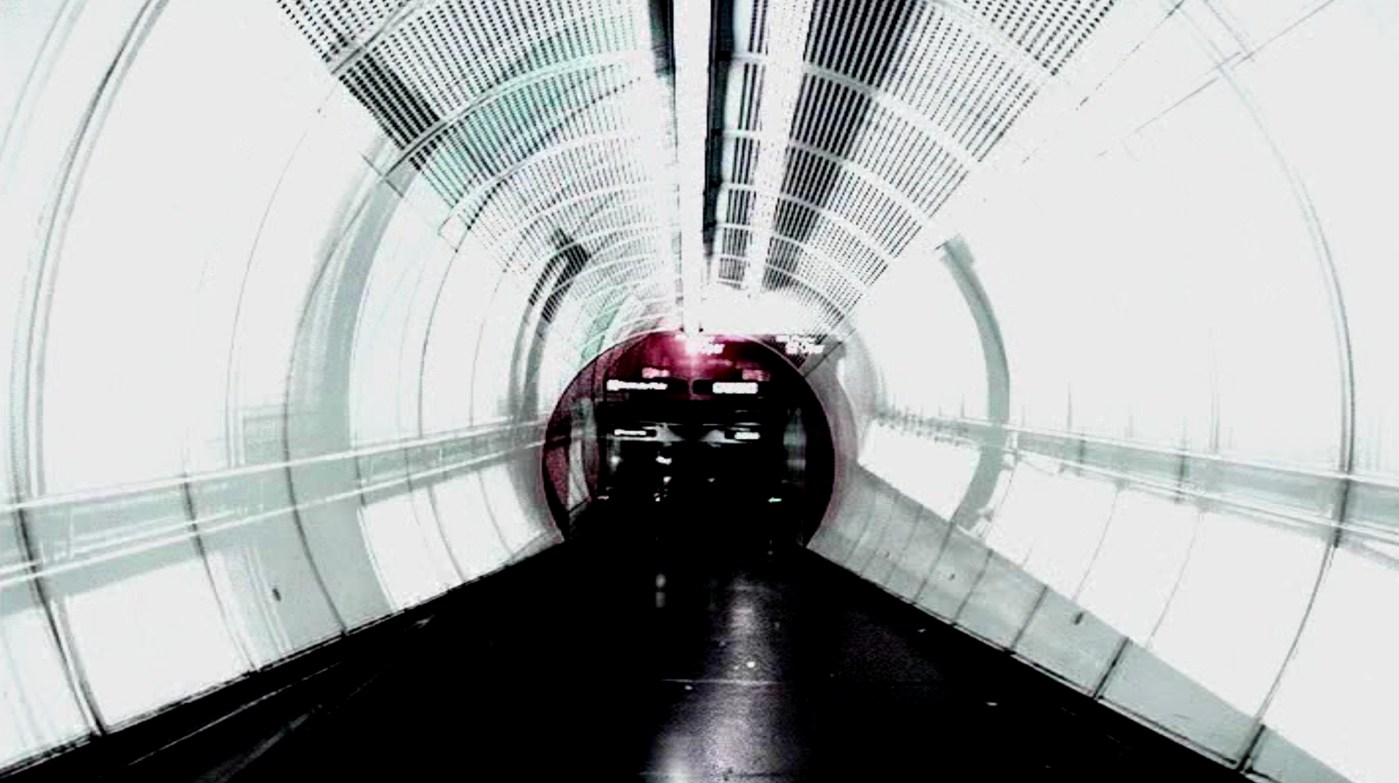 The bonus films take us further inward. Ortem (2004), an arresting work in its own right, descends into the Viennese metro system. Tunnels, stairways, elevators, and security feeds compose a subterranean organism, something cellular and pulsing beneath the city’s surface. Distorted loops create circuits of motion and memory. At times, the tunnels blank out into a red screen, as if the system itself were undergoing a convulsion. The film ends with trains sliding past in opposing directions and a static wall, a return to the network’s resting heartbeat.