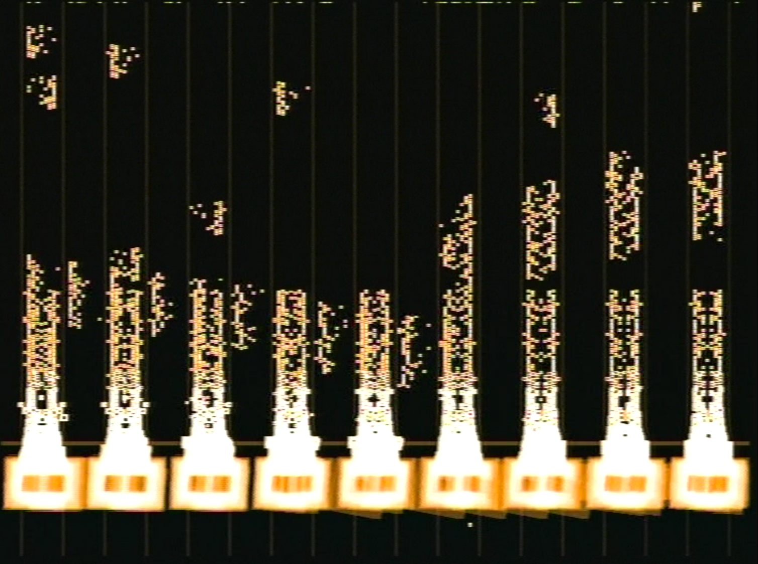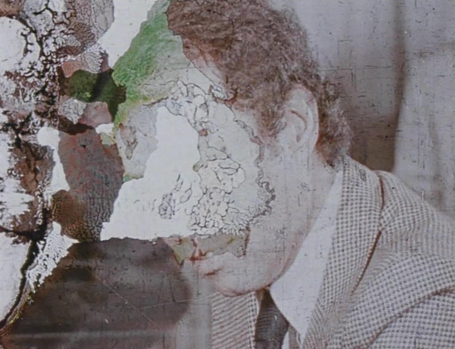 This shift in practice begins with the prophetic ruin of 18/68 Venecia kaputt, where a battleship looms in the haze as blue spots burst across the frame. It is as if Venice and the film stock corrode together. The camera attempts to bear witness even as its own material disappears. That sense of vanishing matter, of form dissolving as soon as it appears, sets the tone for what follows. In 22/69 Happy-end, the viewer sits in a theater, watching Kren watch films, only to have the experience interrupted by stray bursts of pornography. Kren is no longer detailing the images on the screen but exposing the structures of looking that keep them arbitrarily intact.